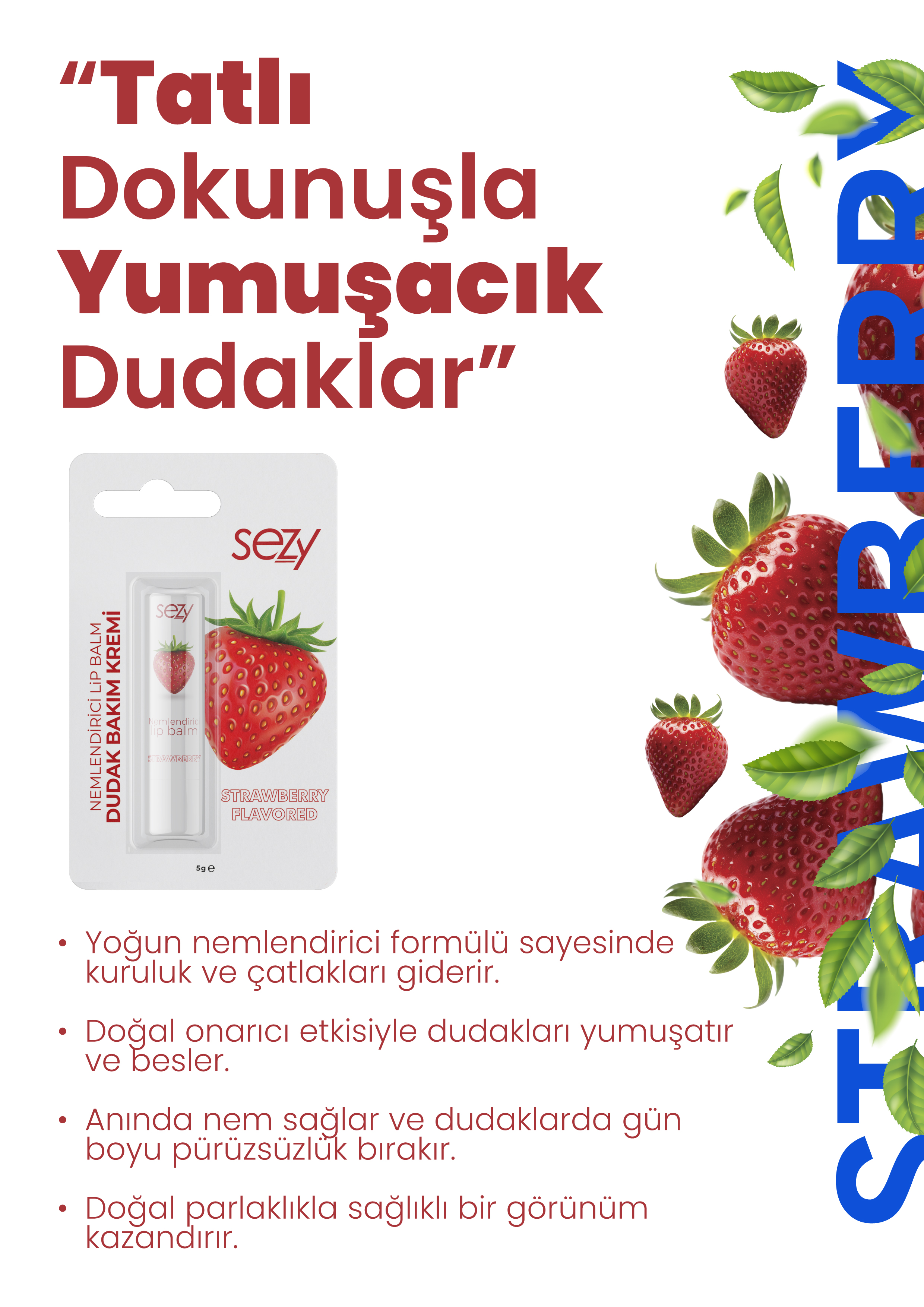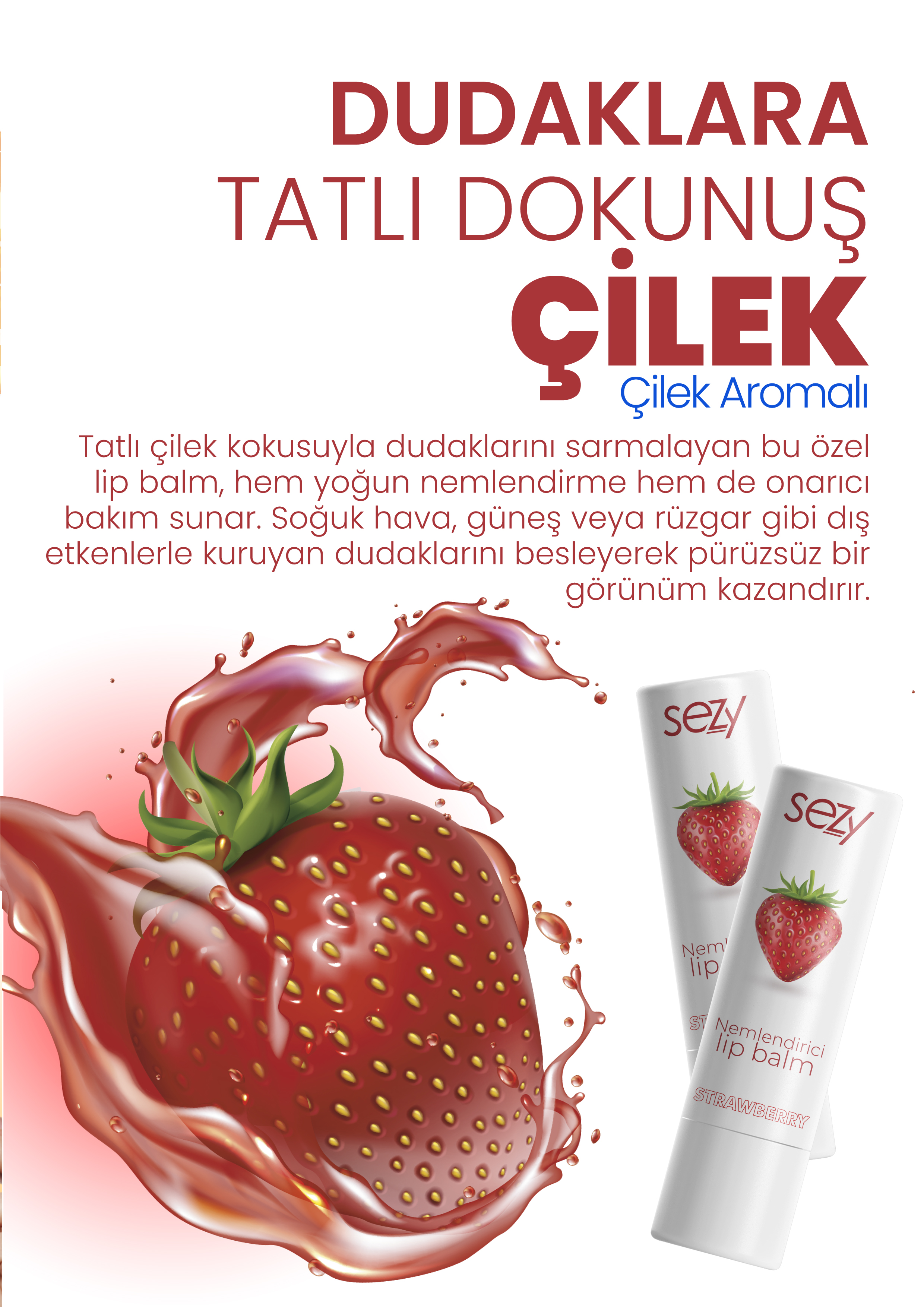 Sezy Çilek Aromalı Lip Balm, dudaklarınıza hem lezzetli bir çilek ferahlığı hem de derinlemesine nem kazandırır. Doğal içeriklerle zenginleştirilmiş özel formülü sayesinde dudaklarınızı kuruluk ve çatlaklara karşı korur. Yumuşacık dokusu sayesinde kolayca sürülür, dudaklarda yapışkan bir his bırakmaz.