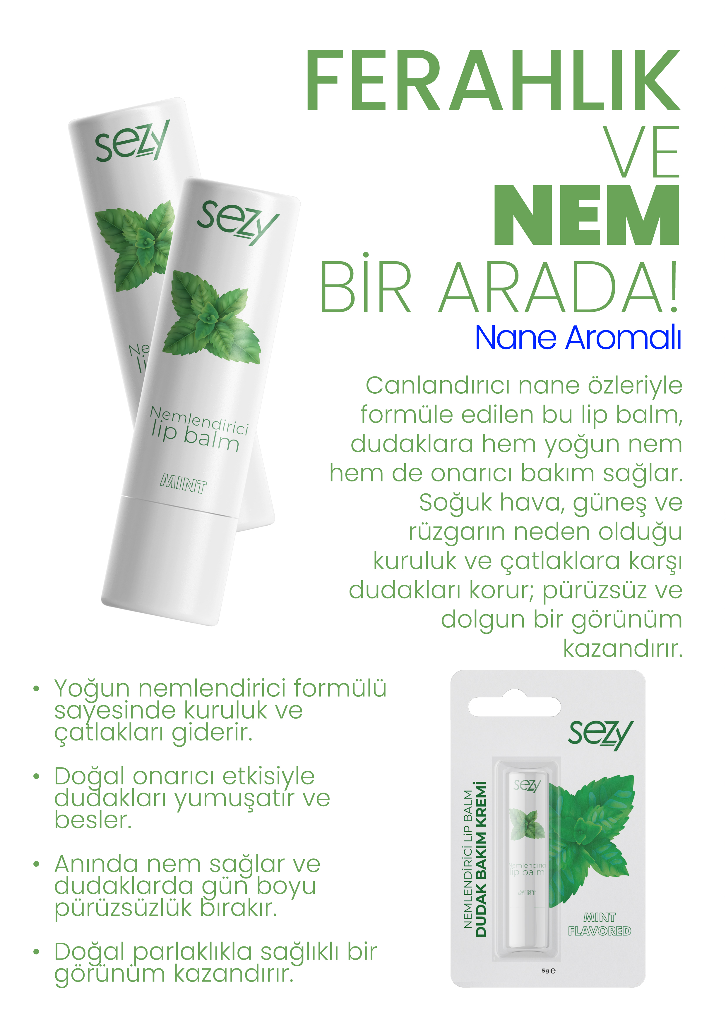 Sezy Nane Aromalı Lip Balm , dudaklarınıza serinletici bir nane aroması eşliğinde derinlemesine nem kazandırır. Doğal içeriklerle geliştirilen formülü, dudakları kuruluk ve çatlaklara karşı korur. Ferahlatıcı etkisiyle dudaklarda tazelik hissi bırakır. Yumuşacık dokusu sayesinde kolayca sürülür ve yapışkanlık yapmaz.